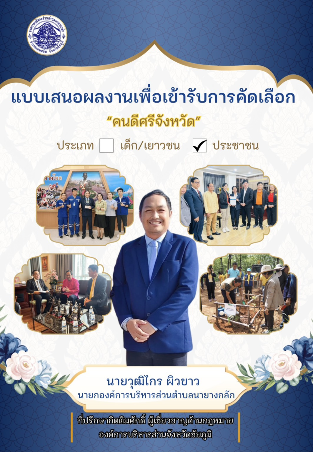 ประชาสัมพันธ์ คณะอนุกรรมการส่งเสริมวัฒนธรรมจังหวัดชัยภูมิ ได้มอบเกียรติบัตรให้ นายวุฒิไกร ผิวขาว นายกองค์การบริหารส่วนตำบลนายางกลัก เข้าร่วมคัดเลือก คนดีศรีจังหวัดชัยภูมิ ประเภทประชาชนทั่วไป ประจำปีงบประมาณ พ.ศ. 2568